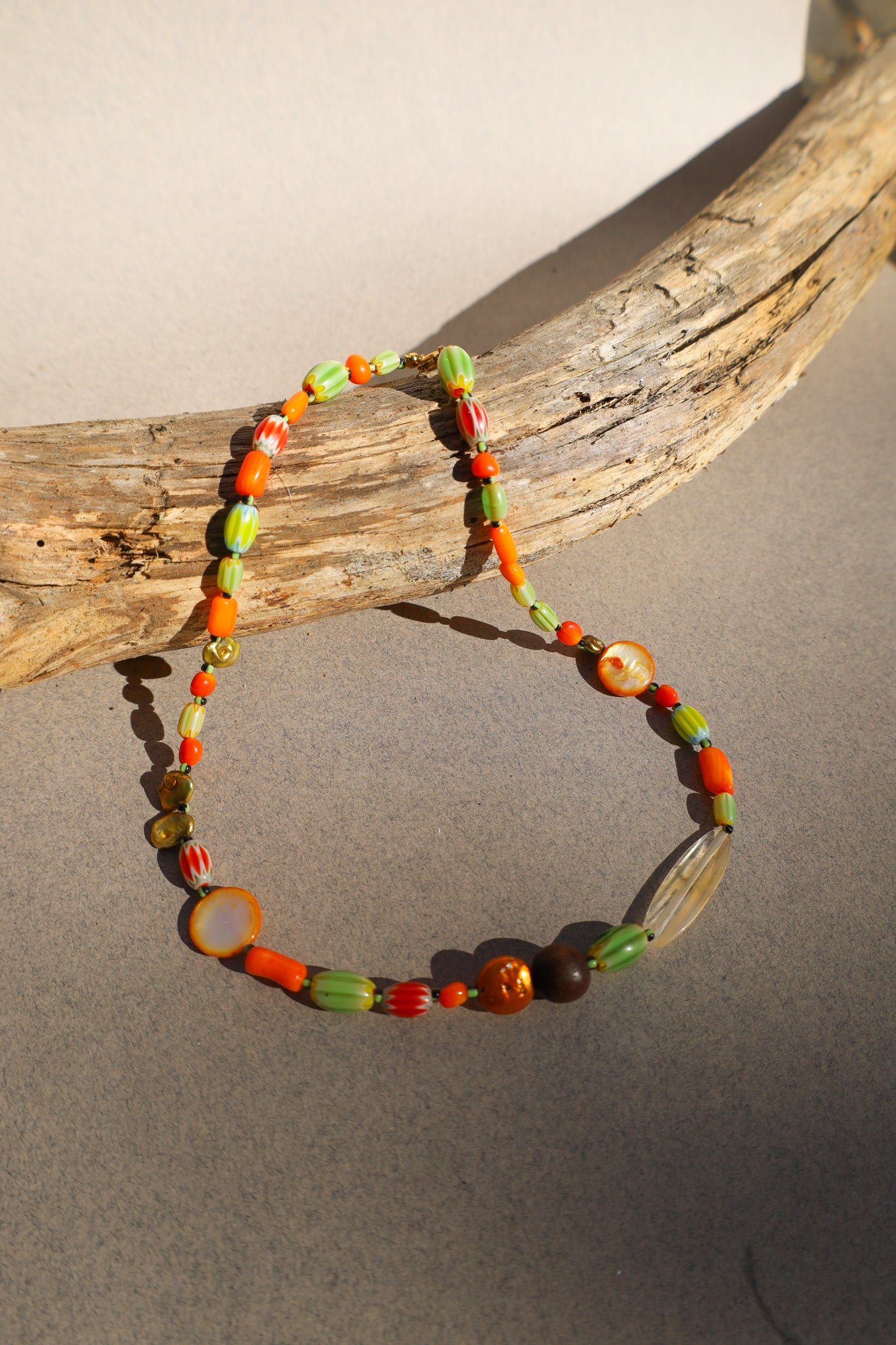 Collier mélange de perle (verre, nacre, bois) au tonalité automnale peut se porter en collier ou bracelet